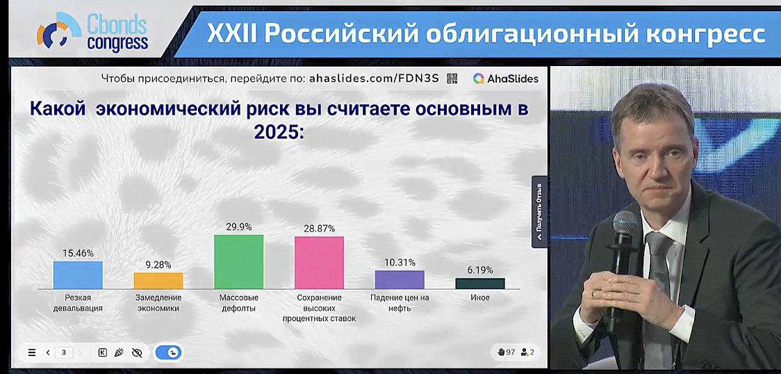 После его выступления опрос участников относительно среднего уровня ставки выглядел так: почти 72% ориентировались на «20% и выше», 25% верили в базовый сценарий ЦБ «17-20%», и лишь 3% выбрали «менее 17%». Вторым был вопрос не про ВВП, а про основные экономические риски: 30% выбрали «массовые дефолты», 29% - «сохранение высоких ставок», 15% - «резкая девальвация рубля», 10% - «падение цен на нефть», 9% - «замедление экономики» и 6% - «иное».