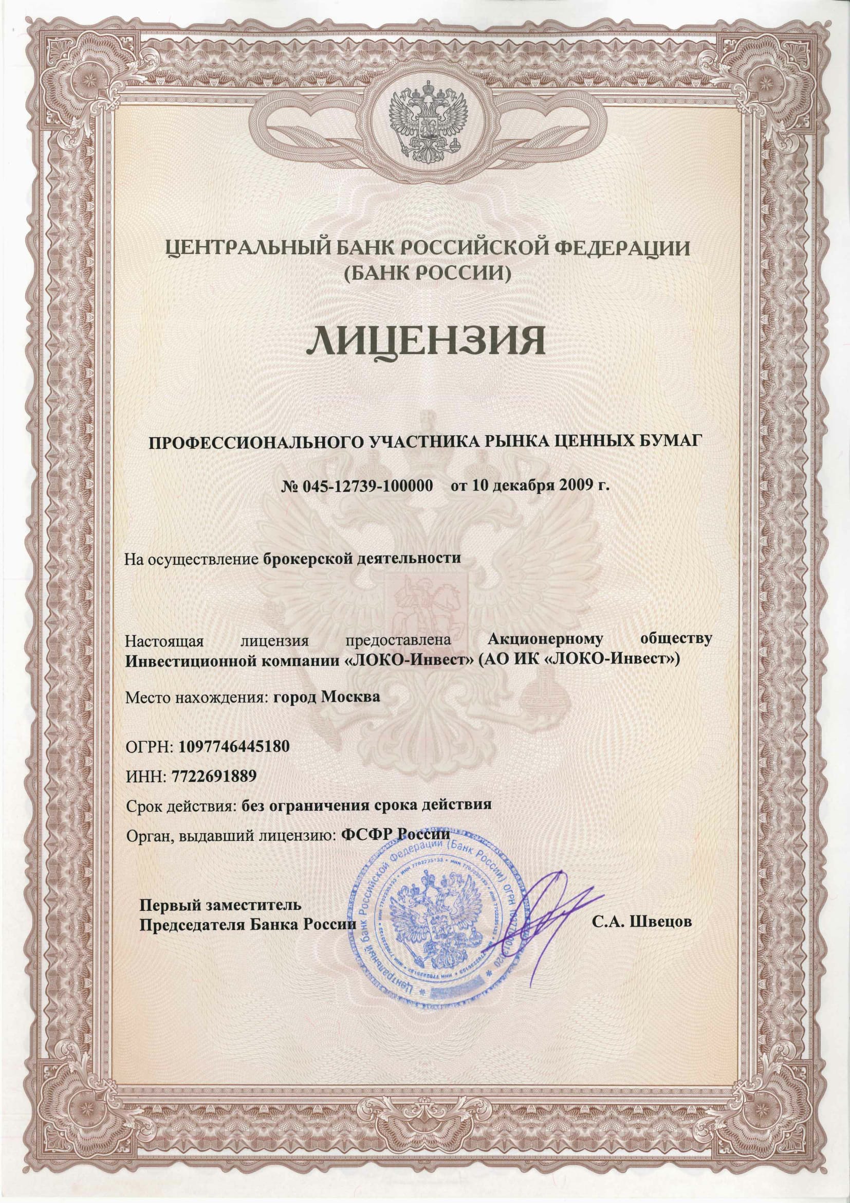 Лицензия профессионального участника рынка ценных бумаг на осуществление брокерской деятельности №045-12739-100000 от 10 декабря 2009 г. Выдана Федеральной службой по финансовым рынкам, актуальна до 09.03.2021 г.